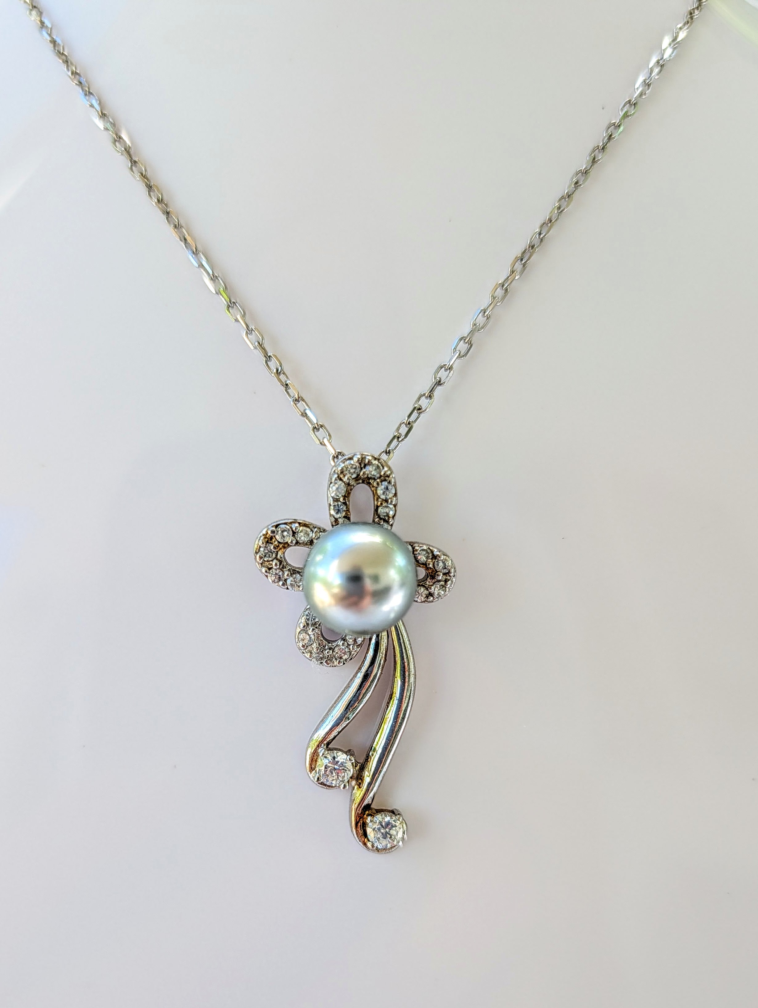 Pendentif avec un motif de fleur en argent rhodié et zirconium. Le tout surmonté d'une perle de Tahiti de couleur argentée.