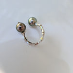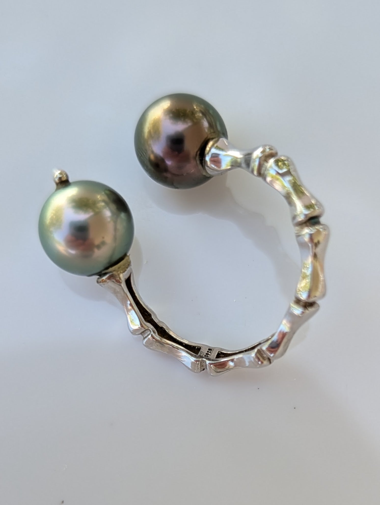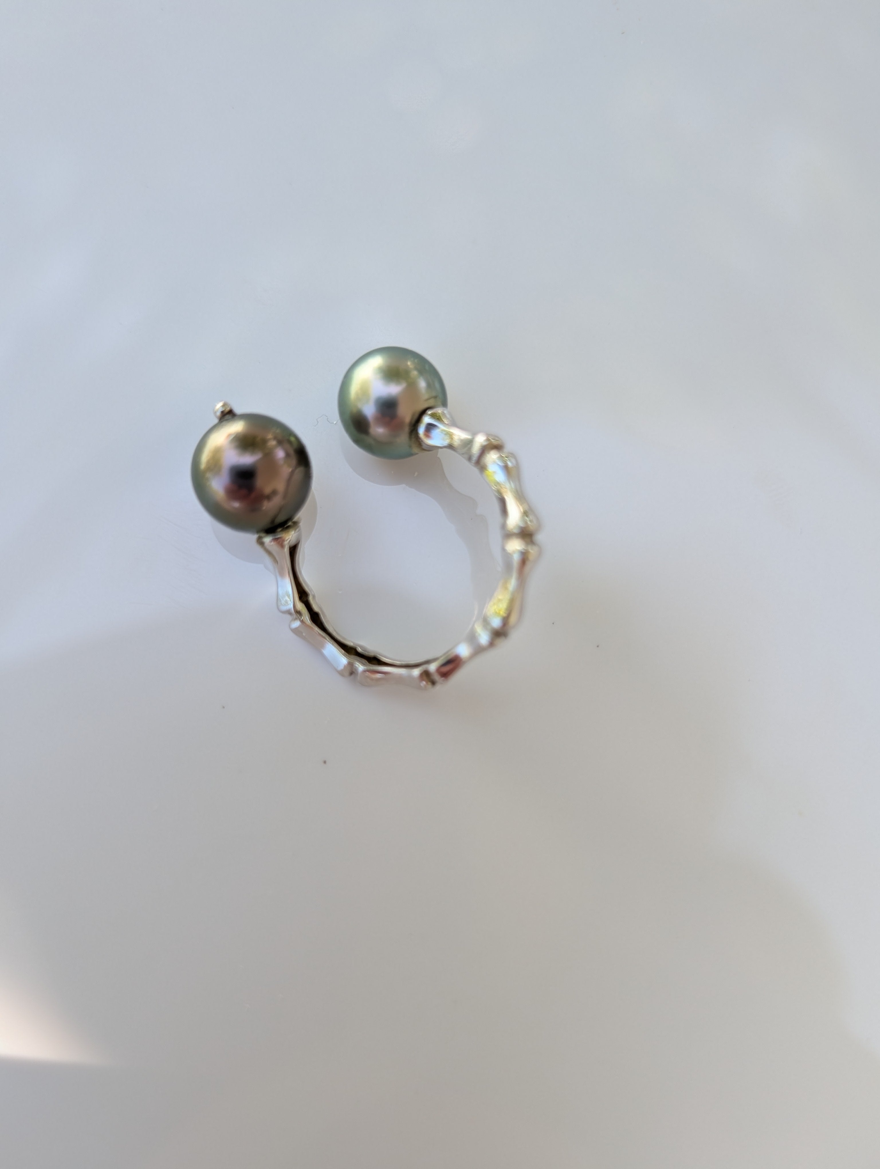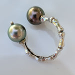 Bague en argent rhodié ajustable, avec deux perles de culture de Tahiti aux couleurs rayonnantes.