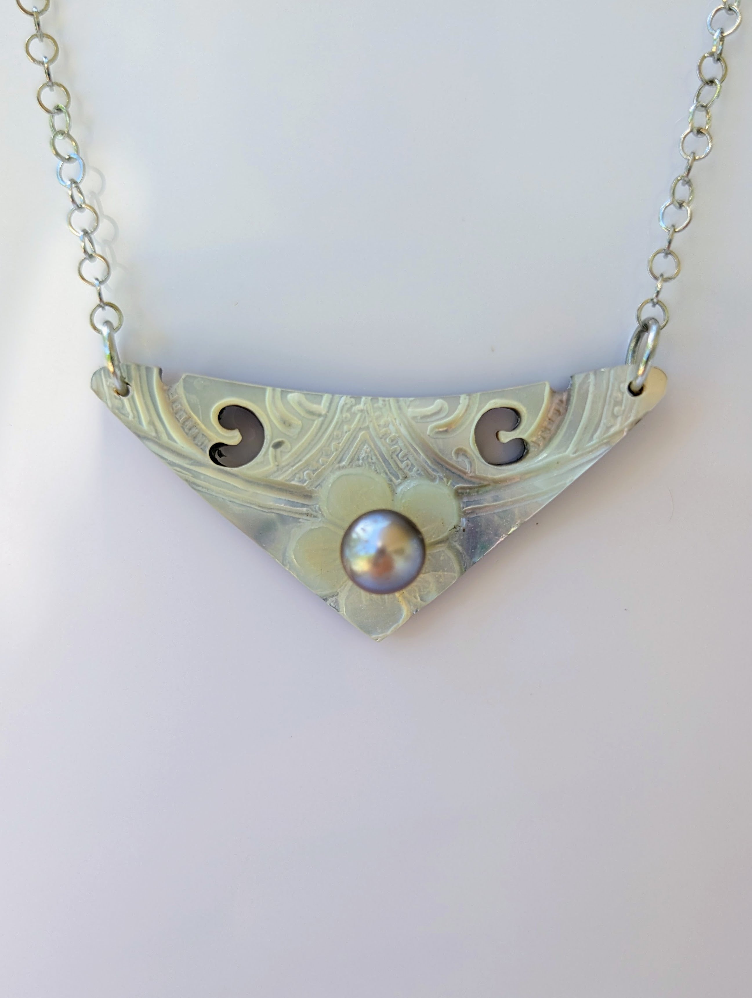 Cette nacre gravée avec une fleur surmonté d'une perle argentée de Tahiti en pistil. Le pendentif est monté sur chaine en argent rhodié.
