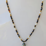 Collier en perle de verre et inoxydable accompagné d'une perle de Tahiti irisée multicolore.