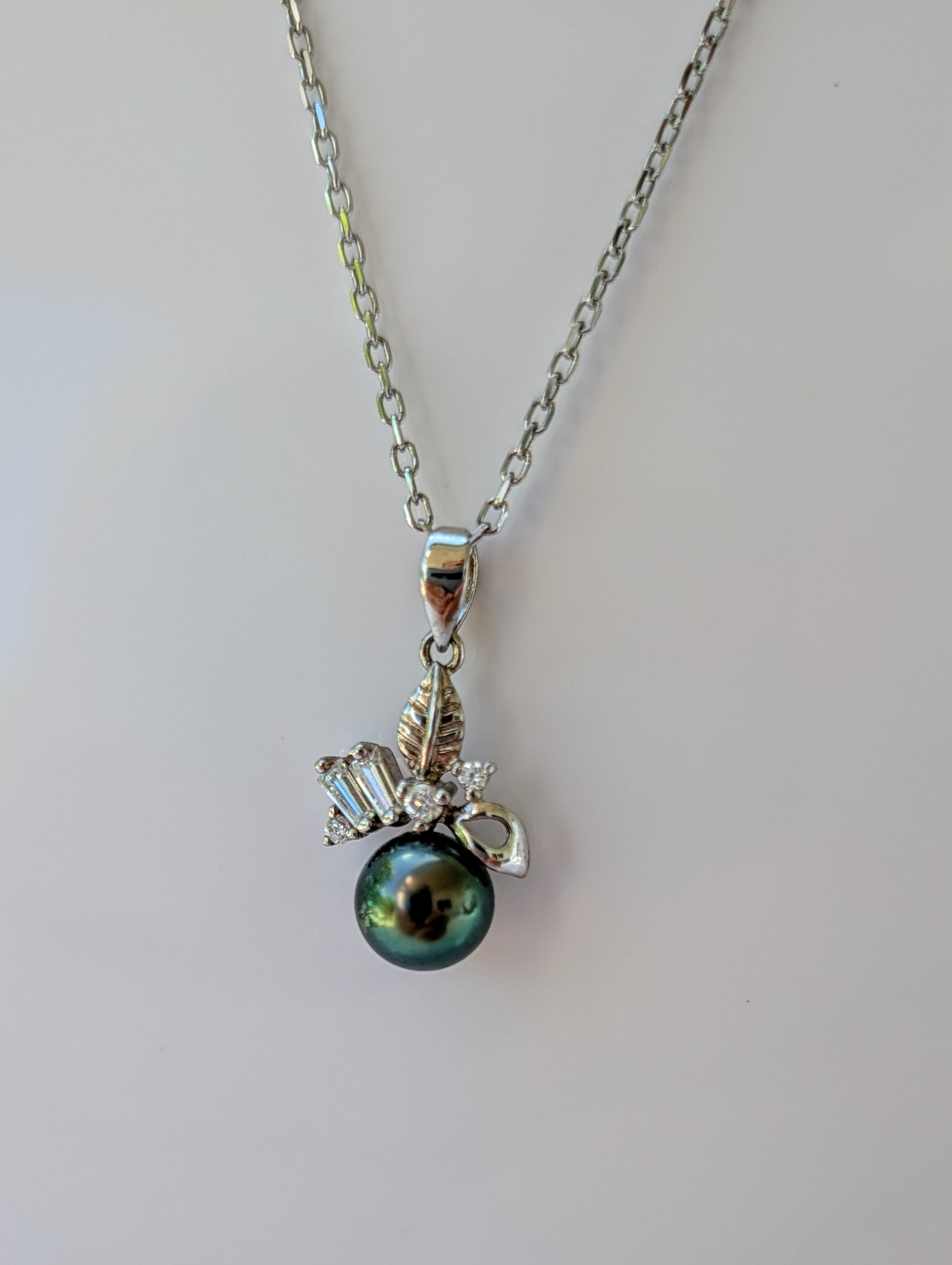 Pendentif en argent rhodié et zirconium représentant une feuille et des pousses. Le tout surplombant une perle de Tahiti de couleur verte. Ce collier est constitué d'une chaine en argent rhodié.