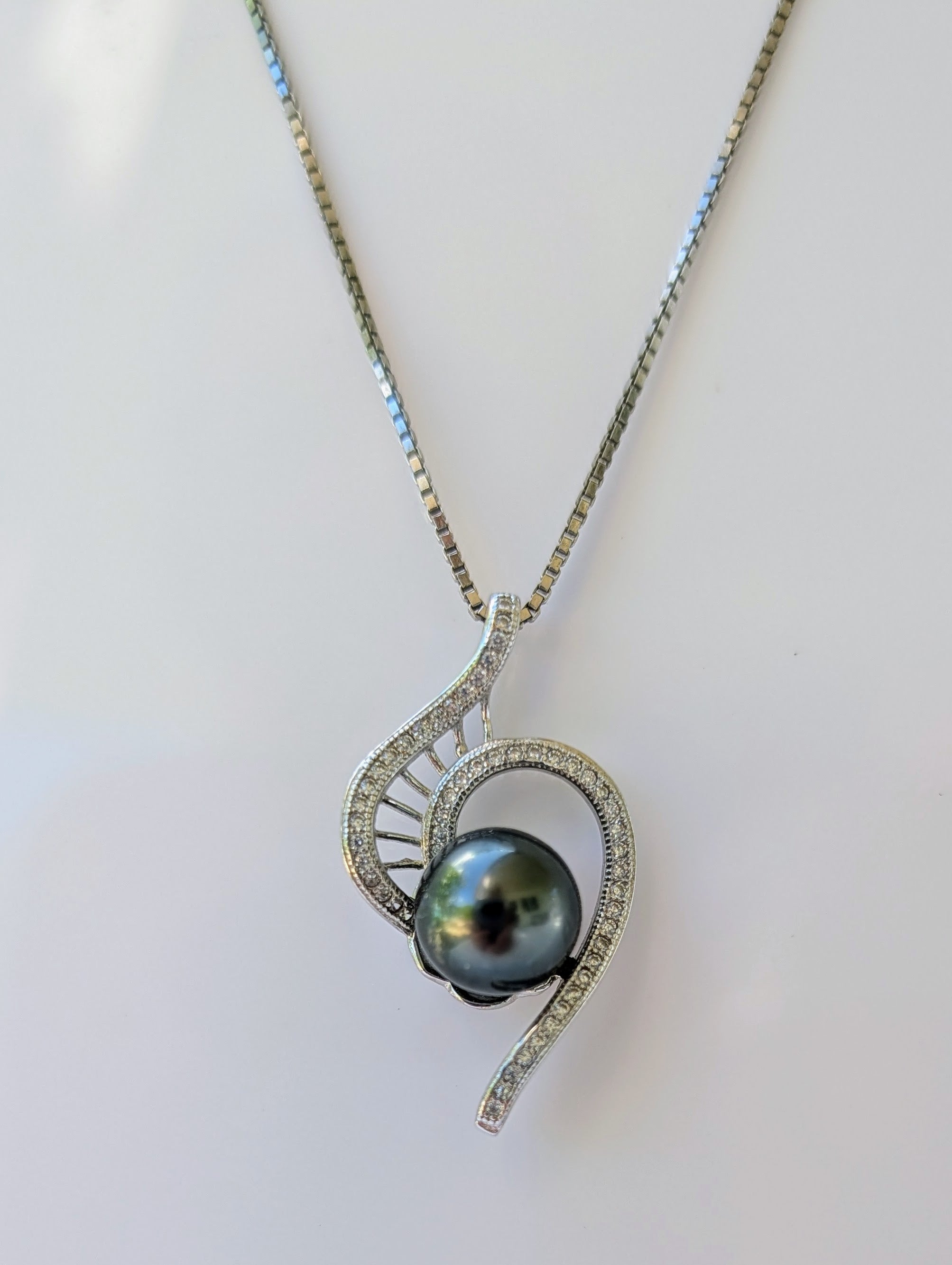 Pendentif en élégante courbe réalisée en argent rhodié et zirconium. Surmontée d'une perle en pendentif de couleur verte. Le tout sur chaine en argent rhodié à mailles serrés.