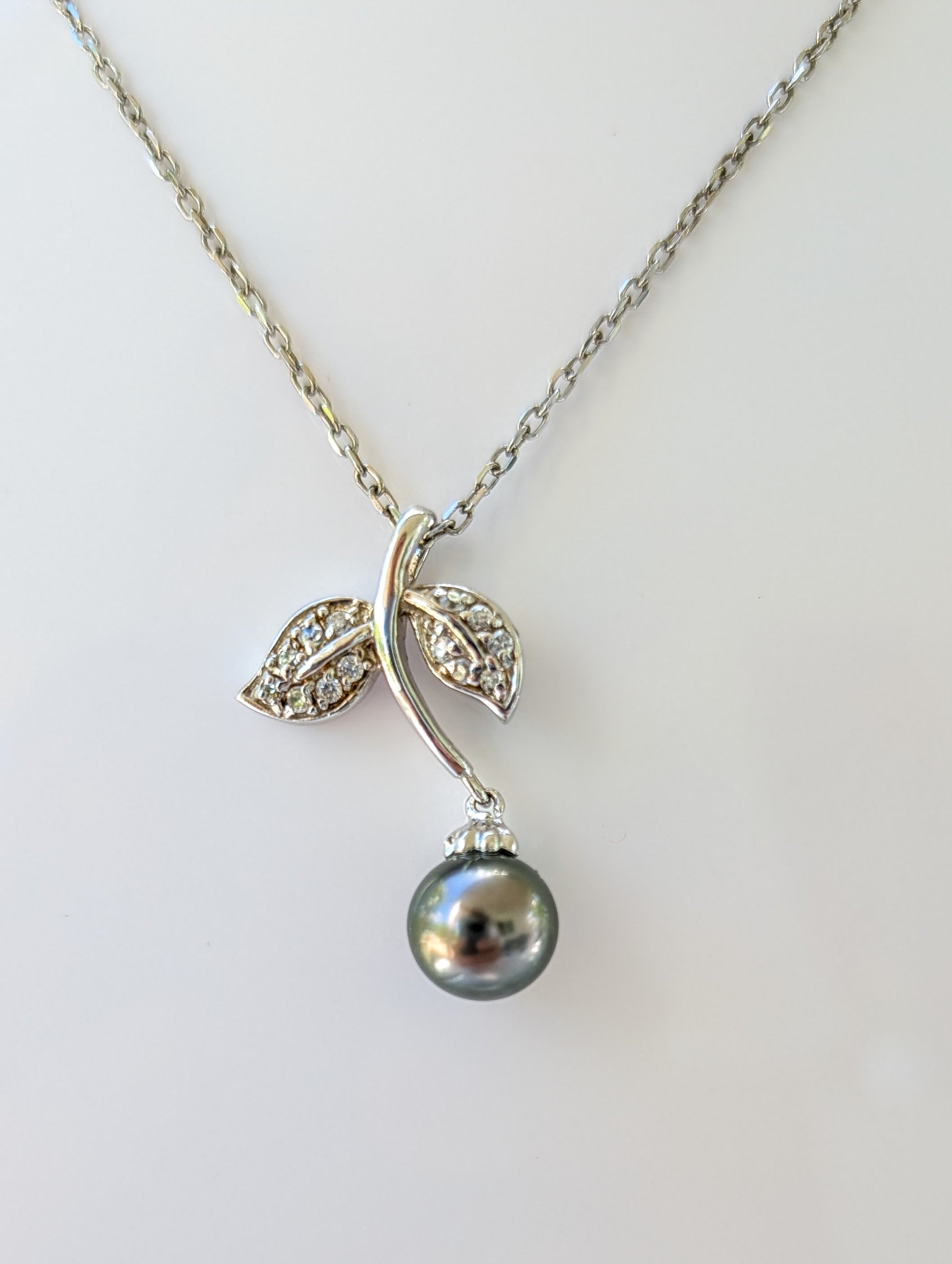 Pendentif avec un motif de feuille en argent rhodié et zirconium. Accompagné d'une perle en pendentif. Le tout sur chaine en argent rhodié.