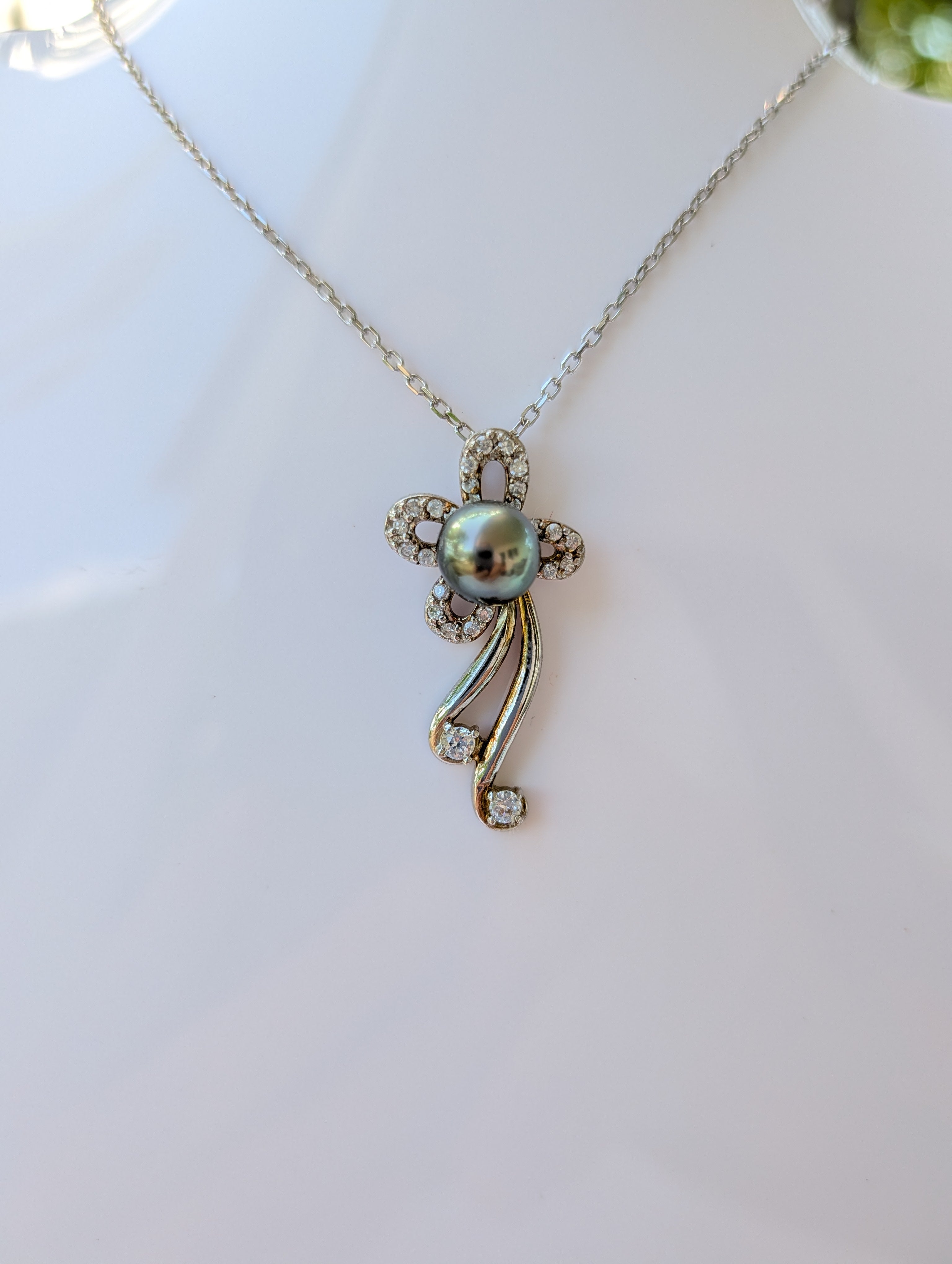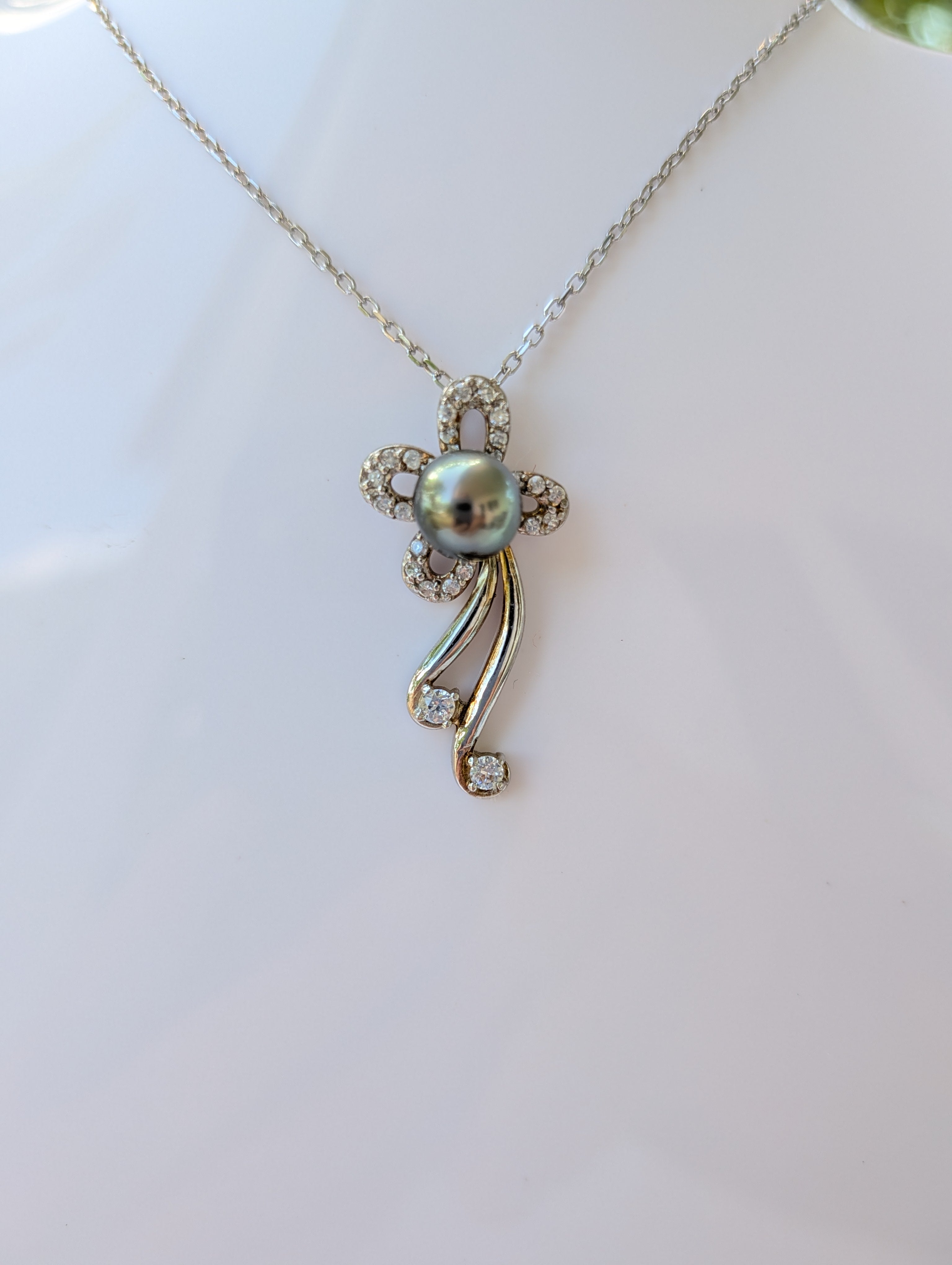 Pendentif avec un motif de fleur en argent rhodié et zirconium. Le tout surmonté d'une perle de Tahiti au reflets verts.